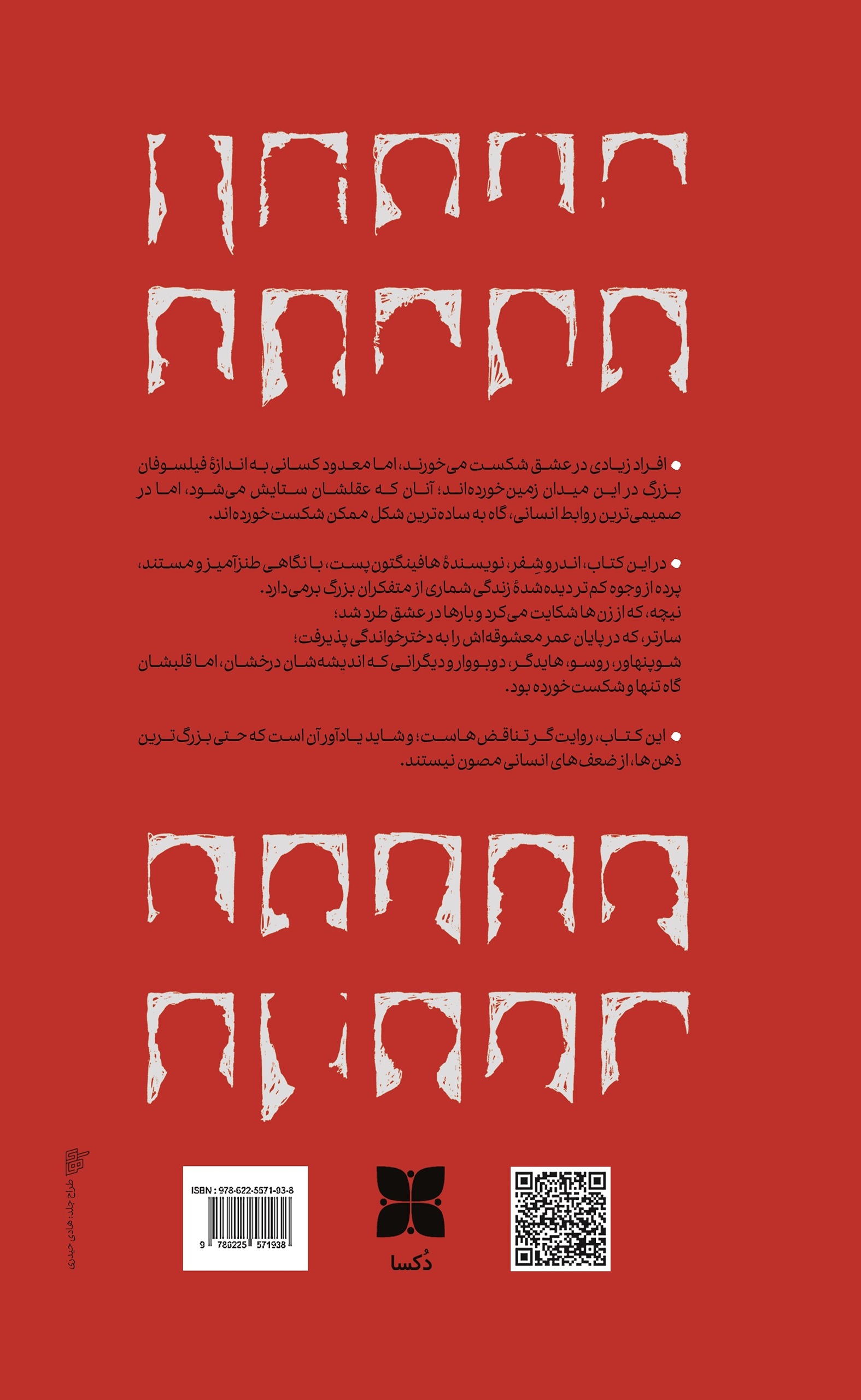 افراد زیادی در عشق شکست میخورند، اما معدود کسانی به اندازۀ فیلسوفان بزرگ در این میدان زمینخوردهاند؛ آنان که عقلشان ستایش میشود، اما در صمیمیترین روابط انسانی، گاه به سادهترین شکل ممکن شکستخوردهاند. در این کتاب، اندرو شِفر، نویسندۀ هافینگتونپست، با نگاهی طنزآمیز و مستند، پرده از وجوه کمتر دیدهشدۀ زندگی شماری از متفکران بزرگ برمیدارد
